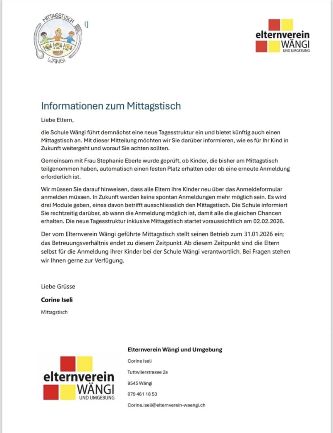 Liebe Eltern, Gerne informieren wir sie über das weitere Vorgehen betreffend Mittagtisch in diesem Brief.